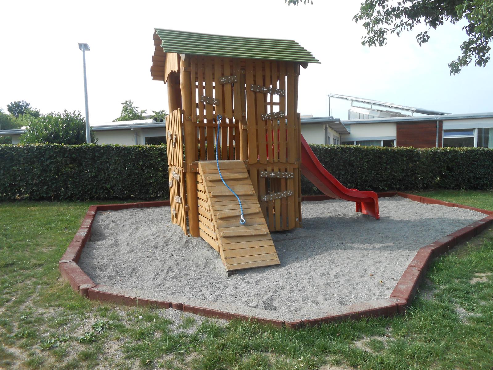 Auf dem Spielplatz befindet sich zum Beispiel ein großes Klettergerät: Die Kletterpyramide ist insgesamt 5,90 m² hoch. Befestigt ist das Spielgerät an einem 6 m³ Betonfundament.